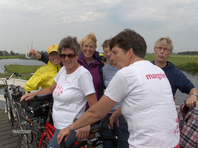Schitterende route langs diverse typisch Noordhollandse stadjes en dorpjes, zoals Monnickendam, Broek in Waterland, Holysloot, Zuiderwoude, Ransdorp en Zunderdorp. Merendeels door weilanden, kwelders, veel fauna, waaronder vele zwanenfamilies. Een gedeelte van de tocht via de IJsselmeerdijk met een weids uitzicht over het IJsselmeer. Bij de start (15 vrouwen) was het nog droog, maar zwarte wolken dreigden.Midden in de polders op weg van Overleek naar Broek in Waterland werden we letterlijk overvallen door een wolkbreuk en onweer.Geen mogelijkheid tot schuilen en binnen een mum van tijd was alles en iedereen doorweekt’.. Sommigen vrouwen waren zelfs bang en haakten af; anderen vonden het wel welletjes vanwege het weer en zijn teruggefietst naar het Hotel. Wij belandden als verzopen katten in een uitbating in Broek in Waterland. Hebben daar alle waardevolle spullen, zoals digitale camera’s, mobieltjes en horloges in veiligheid gesteld. Ook ik had het ‘eerlijk gezegd- wel gezien. Had mijn regenkleding aan een vrouw uitgeleend en zag behoorlijk tegen de resterende tocht op. Toen in totaal negen vrouwen besloten door te gaan, ging ik toch maar mee. Had er niet voor niets zoveel tijd en moeite aan besteed! Achteraf had niemand spijt om door te zijn gegaan, want de regen hield op en de zon liet zich zelfs af en toe zien.