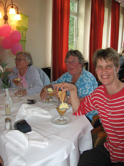 Echt mooi wandelweertje was het niet. Regenjasje aan en regenjasje uit. Maar eerlijk is eerlijk Ineke heeft de wandeling uitzonderlijk goed gepland. Net toen er een geweldige hoosbui losbarstte zaten we te lunchen. Veel mooie meiden gezien onderweg: koeien en schapen. geplukt. De dames lieten wel heel veel achter op al die dijkjes. Minke doet de was. Zij wil met een schone regenbroek thuis komen. Maar ach, nu missen we aansluiting met de kopgroep. Moeten we nu links- of rechtsaf? De mobiele telefoon biedt uitkomst.