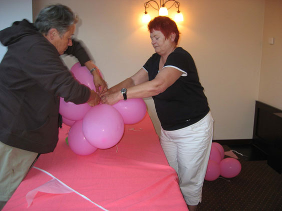 Agatha, Conny, Gerda, Greet, Ineke en Rita zijn klaar voor ontvangst van de deelnemers. De Commissie Ladies day 2008 maakt zich op voor een mooie dag. Met een paar extra helpende handen wordt de zaal versierd. Het weer is naatje maar we mogen toch 62 vrouwen verwelkomen.