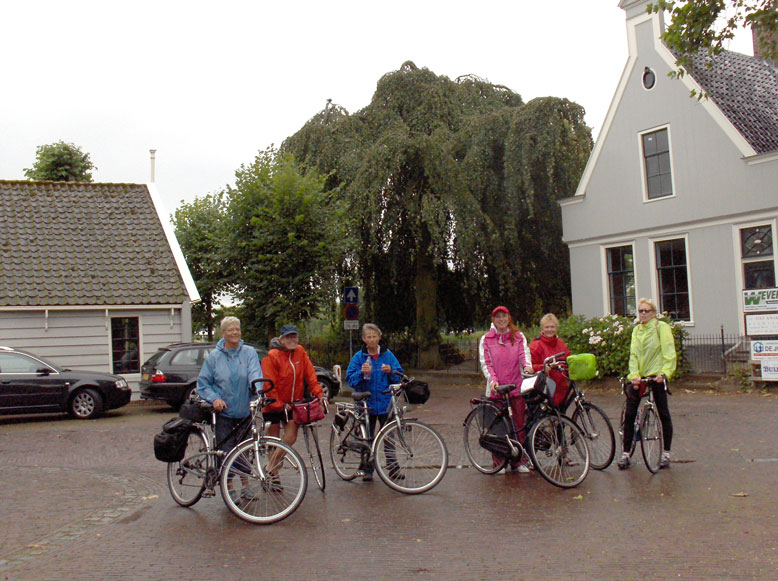 Willy en Ien maakten ons deel van de plensbuien die de fietsgroep moest doorstaan. Op dijkjes zijn helaas weinig schuilplaatsen te vinden. Vanwege het tempo werd de groep in een snelle en in een normale groep gesplitst. Uiteindelijk zorgde de plensbuien voor nivellering. Ondanks alles heeft de fietsgroep genoten van de prachtige afwisselende route, met grote dank aan Willy. Wens van Willy: Wij willen volgend jaar in een droger gebied fietsen….