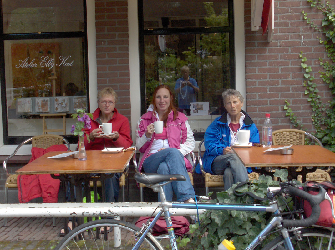 Vanwege het tempo werd de groep na ca 15 km in een snelle en in een gewone fietsgroep gesplitst. De regen was lang niet misselijk. We droogden ons op in het Atelier van Elly Koot in Broek in Waterland. In het kleine museum kwamen we even thuis in de verleden tijd. De ladies van de lange fietstocht hebben de toren (32 meter) in Ransdorp beklommen en hadden een prachtig uitzicht. We deden een test om groene energie op te wekken. Maar of het lukte, dat vertelt het verhaal niet. Gelukkig was het op dat moment ook droog. De foto van de mooie zonnebloem vlakbij het dorpje Ransdorp werd juist toen de zon even scheen genomen. Een zeer bijzonder moment dus.