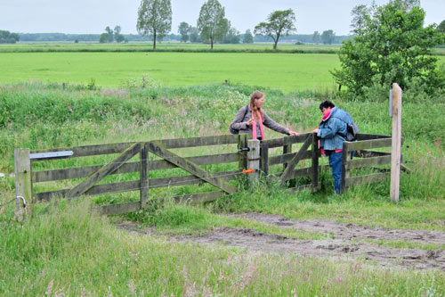De koeienmeisjes en andere dieren zijn verbaasd over zoveel schoons op hun pad. De regent komt wel of niet door. Even overleg over de korte of de lange wandelroute. Uiteindelijk willen we ook wel even naar de rommelmarkt in Annen.