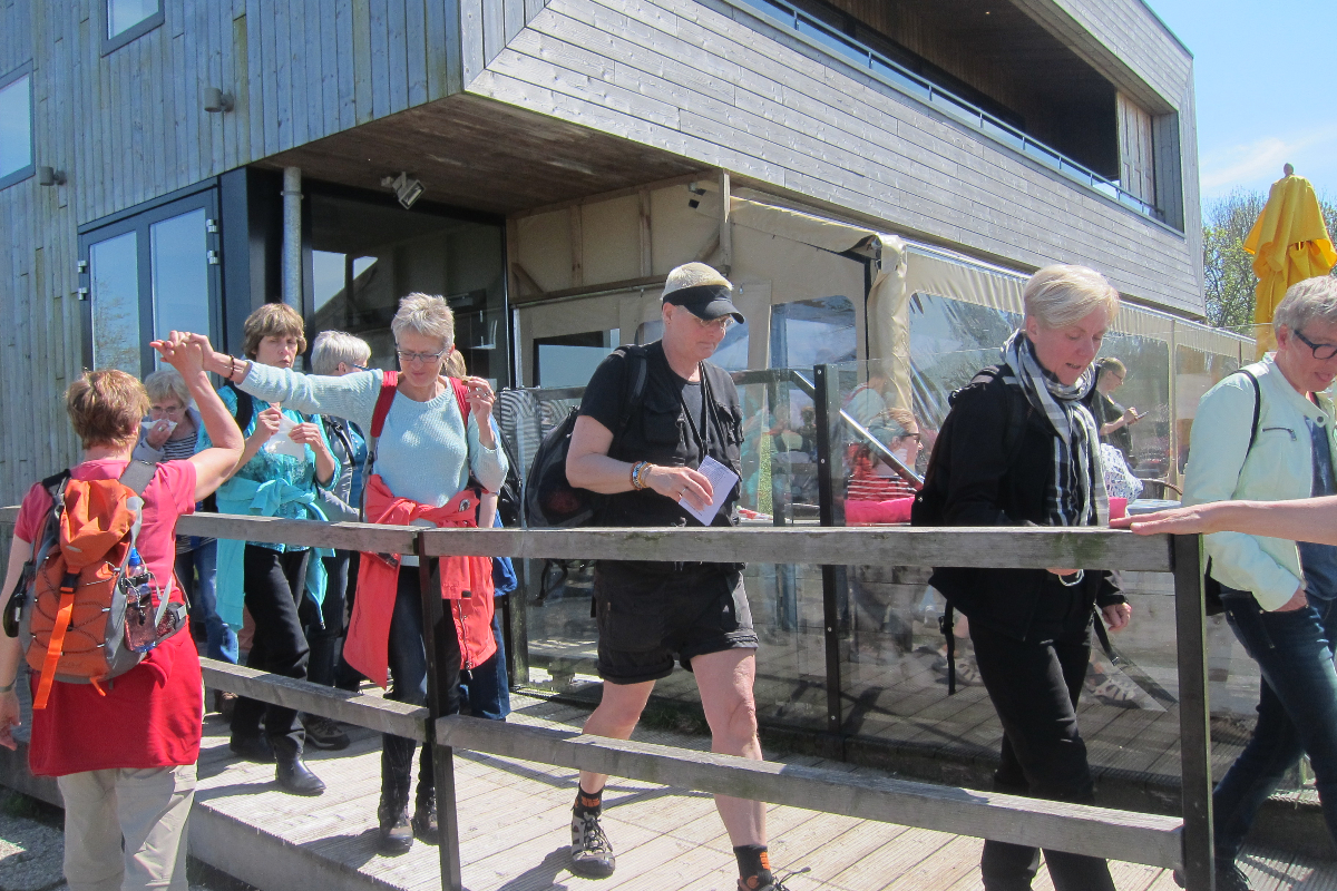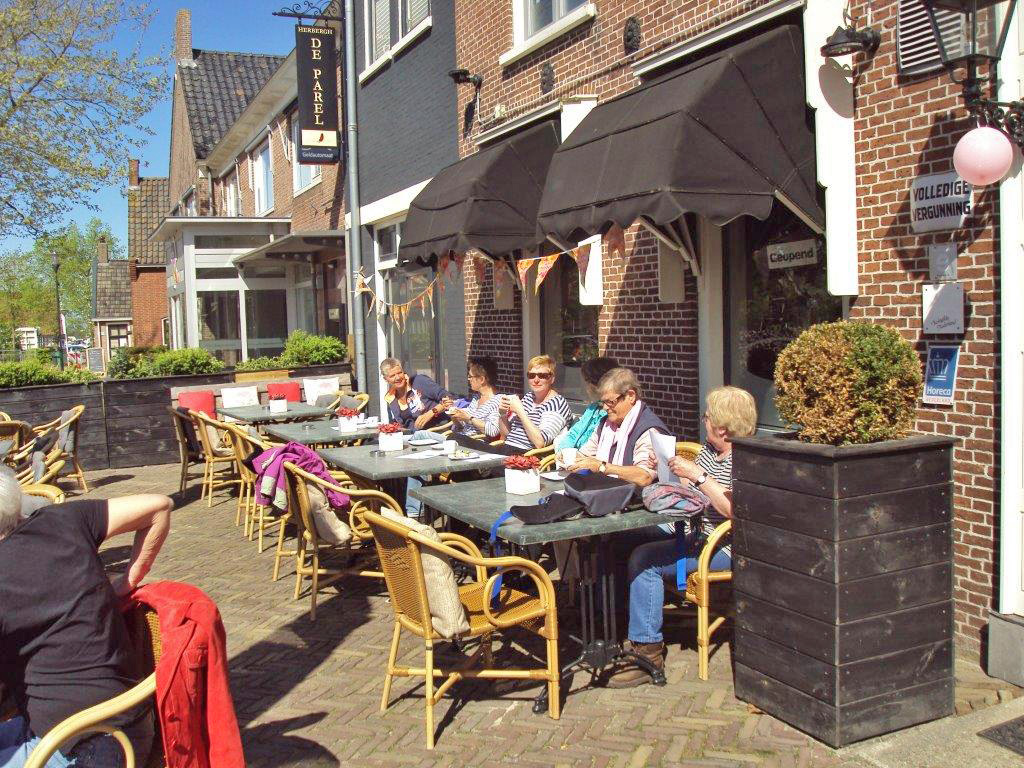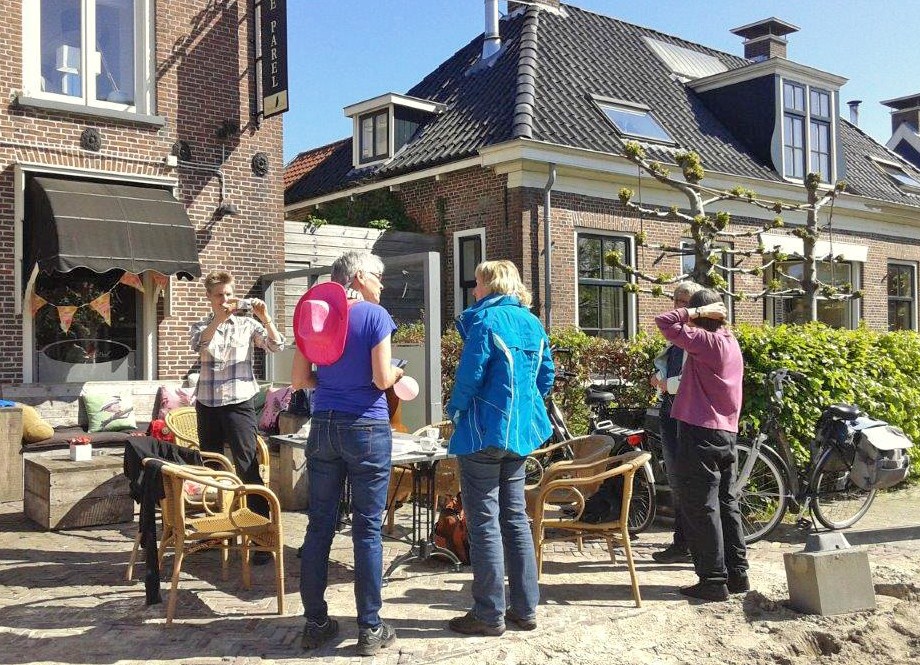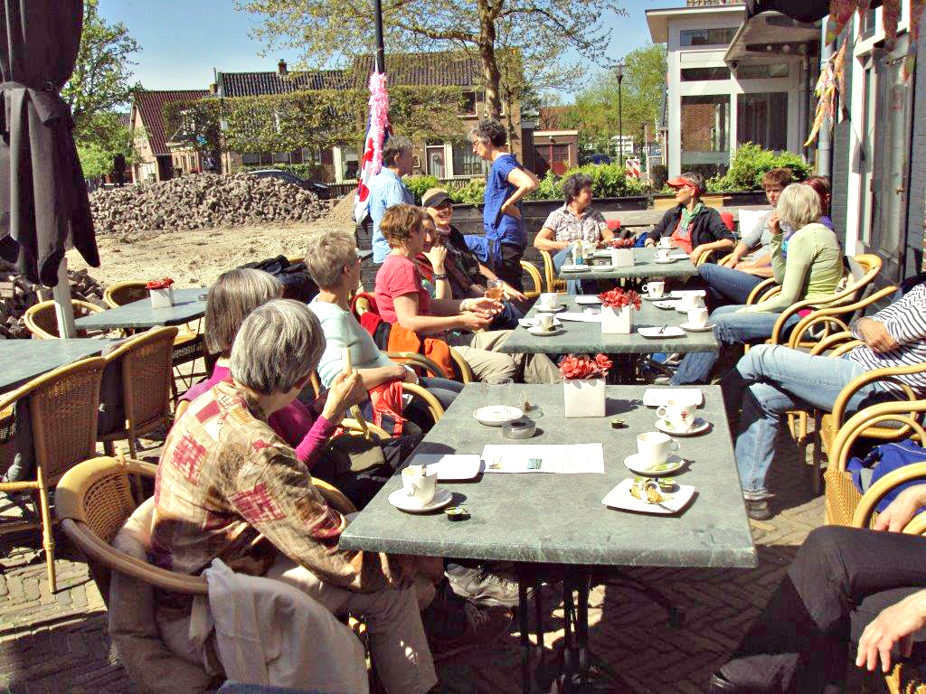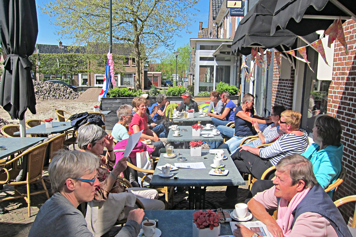 Om half 5 komen de wandelaars van de lange route aan de groene kant van Eastermar weer binnen. Zij hebben 19.880 stappen gezet en 628 calorieën verbrand. Zij worden met hartelijk applaus begroet door de dames van de korte wandeling op het terras van de herberg. Tijd voor een verkwikkend drankje.